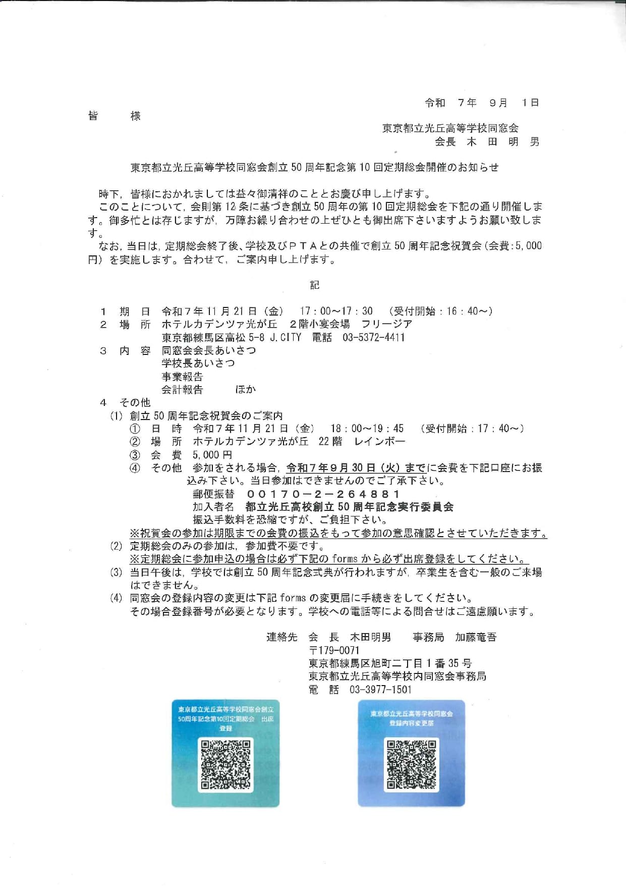 令和7年11月21日(金)午後5時からホテルカデンツァ東京にて開催します。詳細は、登録住所のある全会員宛に書面を送付しましたのてご確認ください。なお、正会員の登録番号は卒業期(2桁)卒業時組(2桁)出席番号(2桁)の6桁で構成されていますので、問合せの際には必ず登録番号を記入してください。